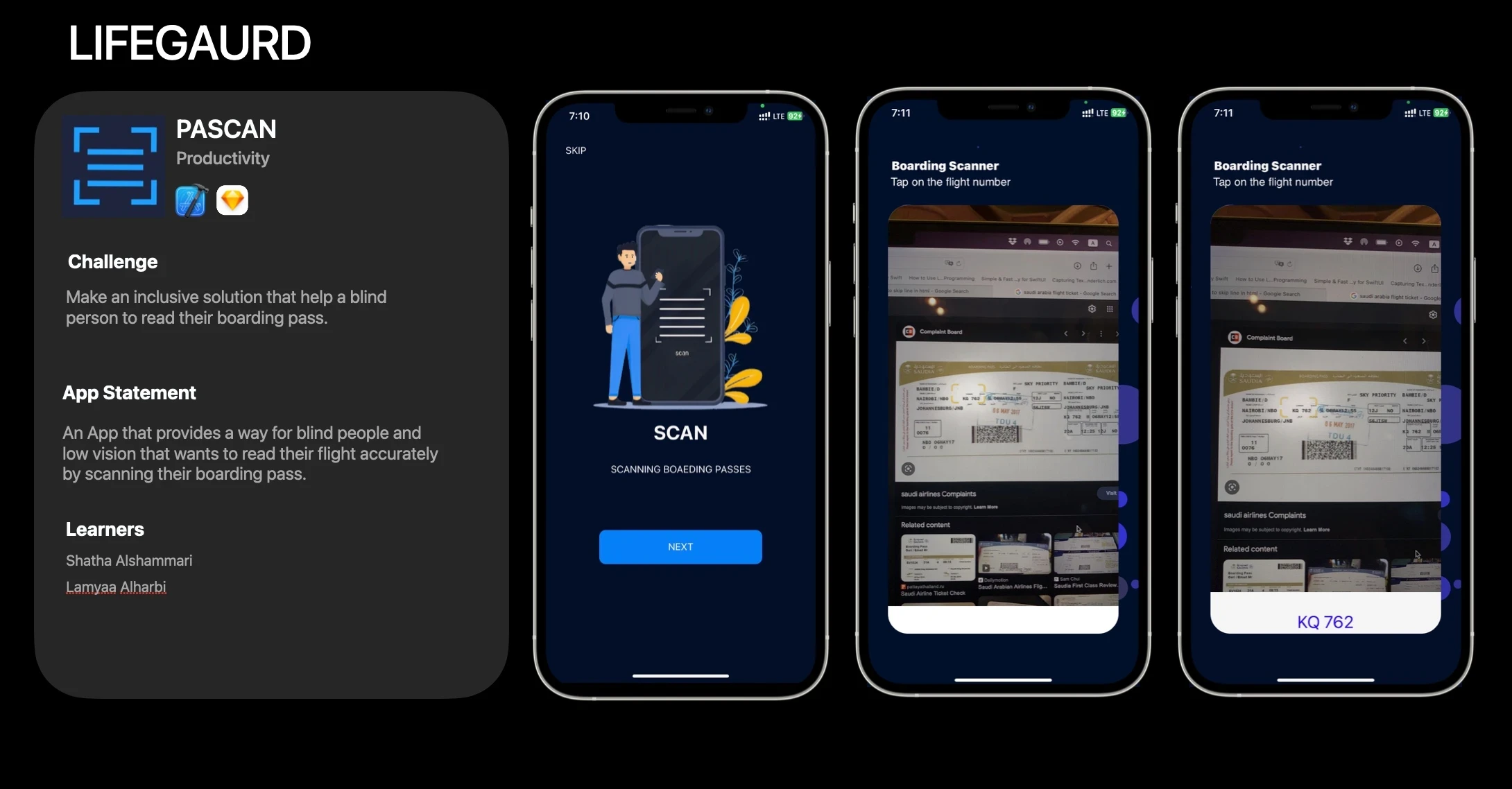 لذا، فإن PASCAN هو تطبيق يقوم بمسح بطاقات الصعود إلى الطائرة للأشخاص المصابين بالعمى. وتم تصميم وبناء التطبيق باستخدام xCode واستيراد مكتبة VisionKit التي ستساعد في مسح بطاقة الصعود وطباعتها ومن ثم قراءتها بواسطة VoiceOver.